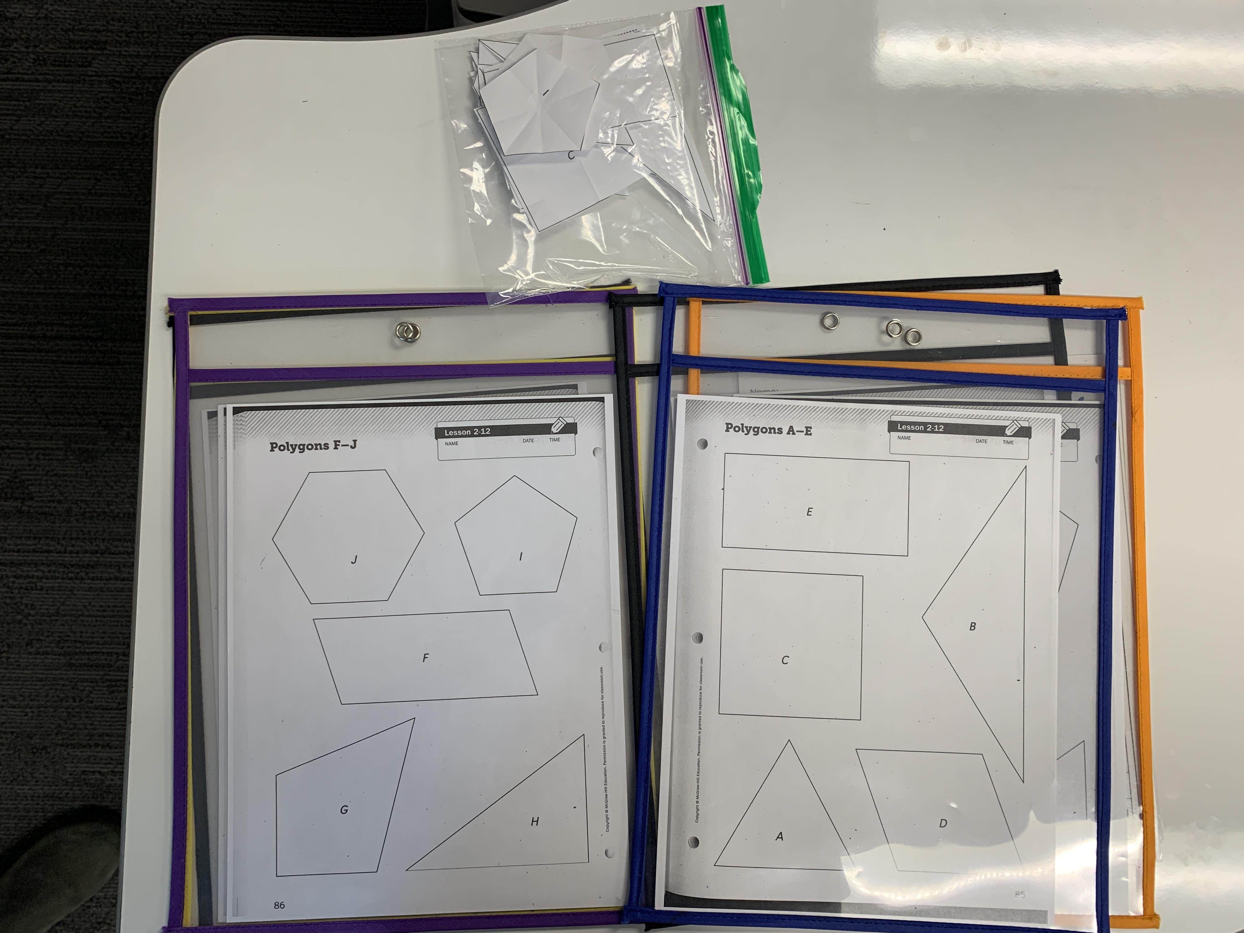 The first group of five headed for the back table, where we and the teacher were standing. This activity was the first in the sequence, and it focused on lines of symmetry. Mrs. McLaughlin handed out clear plastic slip pouches and dry erase markers. In each pouch there was a double-sided sheet of paper with the activities on them. The first side consisted of half of a star with a line down the middle. Students were asked to use their dry erase markers to fill out the other side, aka finish drawing the star. Once the students were done with that they flipped the pouches over to reveal four images of easily recognizable objects. They were asked then to find and draw all of the lines of symmetry for each object. The next activity was similar, just with a variety of different shapes instead of objects. The images below are of this activity.